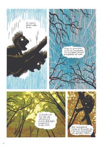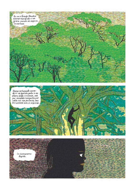 Mettere Rapida in copertina è stata una delle proposte di Canicola Edizioni. Mi sono reso conto mentre la disegnavo che aveva senso metterla in copertina anche per ragioni narrative. Rapida è una sorta di pre- Eva, così come il protagonista viene prima-di-Adamo, con la differenza che il personaggio di Rapida compare solo ben dopo la metà del libro. Rapida è il personaggio che lega il popolo delle caverne al popolo del fuoco, di cui fanno parte nostri più recenti predecessori, almeno nel racconto.