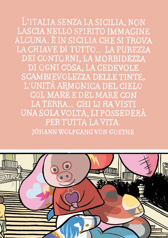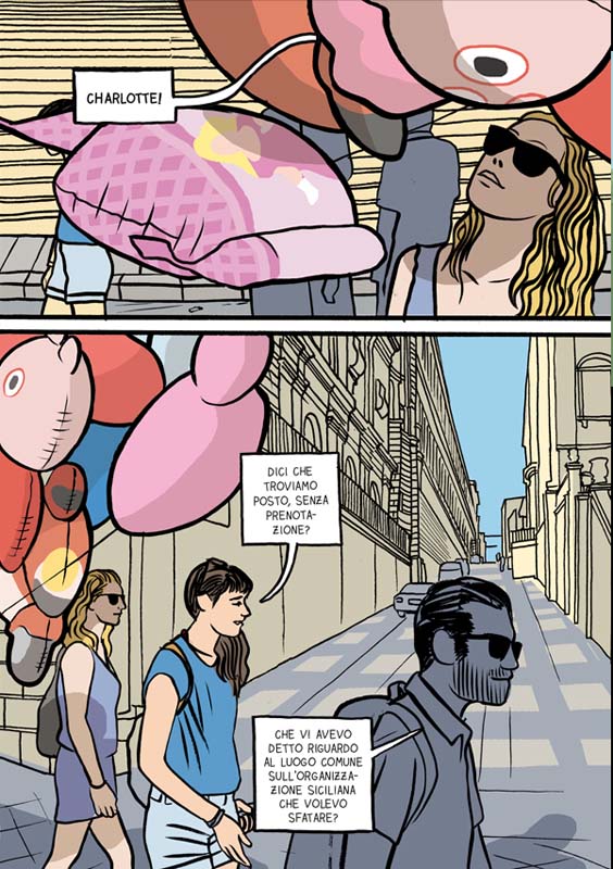 Perché la Sicilia è colore. Non vorrei sembrarti un agente turistico, ma è vero. Non hai bisogno di filtrini di instagram per fare una bella foto. Basta puntare e scattare. Avevo già disegnato delle storie brevi a colori. Mi piacevano e piacevano anche ai tipi di BAO Publishing. Sono stati loro a proporre la quadricromia. Mi ha permesso di essere anche più veloce nel disegno. perché sapevo che il segno sarebbe stato soltanto la metà del libro. Poi ci sono tanti altri accorgimenti, dall’eliminazione dei margini, allo sfruttare il centro del libro. Fino al dare spazio e importanza alle cose che di solito nei fumetti non ci facciamo mai caso, come ad esempio le didascalie in alto: “più tardi”.